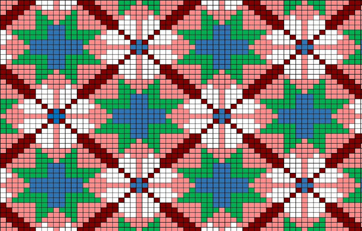 Fifth attempt – I like the cross on the left, but working the “flower” on the right with just pink and white made me nearly go cross-eyed. It was very difficult and I decided to add some contrast. |